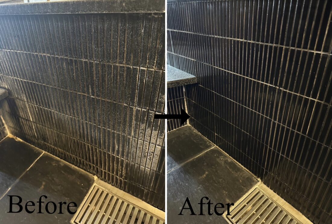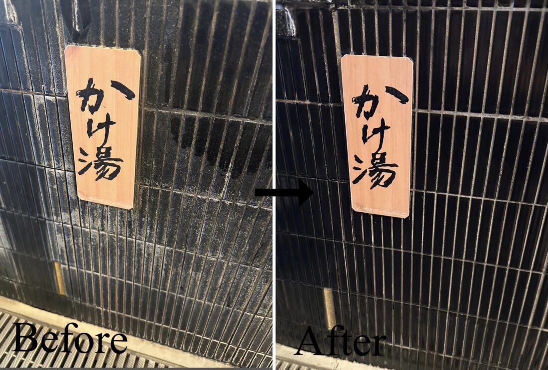 ビジネスホテルの大浴場やスーパー銭湯でよく見られます御影石や石材タイルについたシリカ汚れ(白い汚れ)・カビ汚れが長期的に放っておくととても落ちにくい汚れに変わってしまいます。
