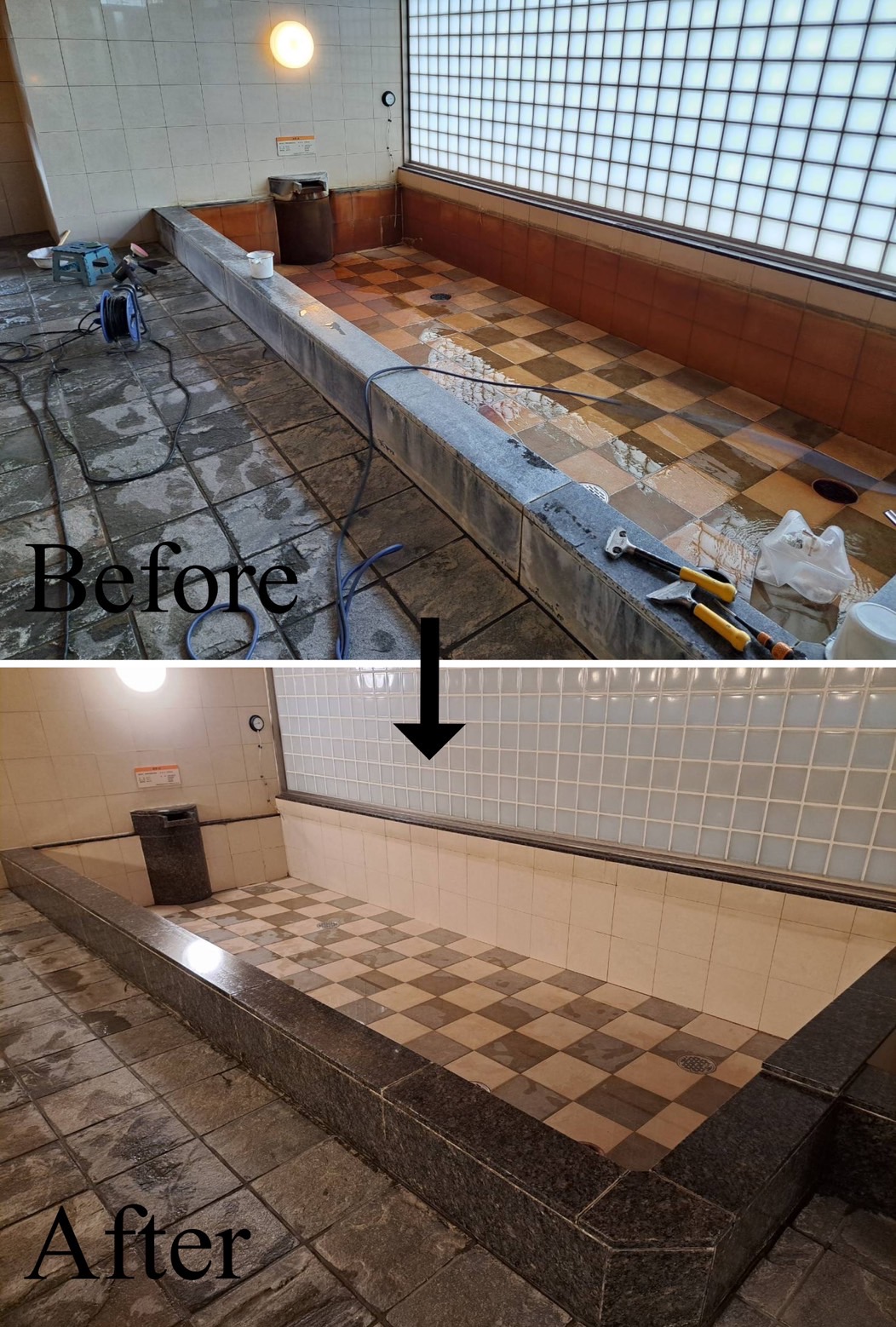 ビジネスホテルの大浴場やスーパー銭湯でよく見られます御影石や石材タイルについたシリカ汚れ(白い汚れ)・カビ汚れが長期的に放っておくととても落ちにくい汚れに変わってしまいます。